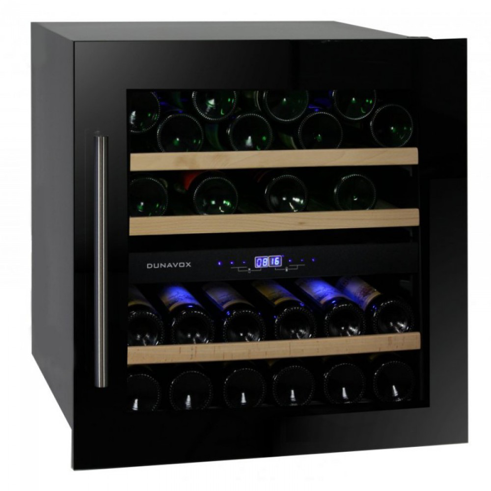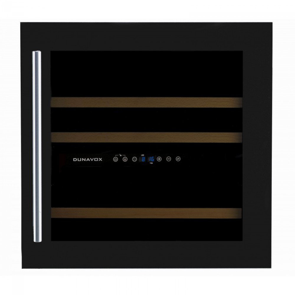 Dunavox DAB-36.80DB Компрессорный встраиваемый винный шкаф на 34 бутылкиВинный шкаф Dunavox DAB-36.80DB - это двухзонная, эргономичная модель, оснащенная компрессором с минимальным уровнем шума.Шкаф оснащен сенсорной панелью управления, с помощью которой пользователь выбирает необходимый температурный режим работы аппарата. В модель DAB-36.80DB встроены такие функции как: функция звукового оповещения об открытой двери, функция увеличения влажности воздуха и энергосберегающая функция "Отдых", позволяющая при работающем холодильнике на время отключить дисплей, подсветку и звуковые оповещения.Корпус модели DAB-36.80DB металлический с покрытием черного цвета, дверца выполнена из прозрачного двойного стеклопакета, защищенного от воздействия ультрафиолетовых лучей. Ручка двери удобная, накладная, выполнена из нержавеющей стали. Цифровой индикатор температуры и внутреннее освещение на светодиодах синего цвета.Винный шкаф Dunavox DAB-36.80DB предназначен для встраивания в нишу. Для обеспечения охлаждения компрессора и отвода горячего воздуха необходимо предусмотреть сквозную вентиляционную нишу площадью не менее 200 см² от цоколя до верхней части мебельного модуля (см. рисунок).Рекомендуется устанавливать винный шкаф Dunavox DAB-36.80DB вдали от прямых солнечных лучей и источников тепла (духовки, нагревателя, батареи и т.д.). Прямой солнечный свет может плохо повлиять на корпус, а источники тепла могут увеличить энергопотребление. Не допускается установка аппарата рядом с плитой или прибором, который может нагревать воздух в пространстве 1-5 см от его корпуса (например, рядом с холодильником, у которого теплообменная стенка граничит с аппаратом). Не рекомендуется устанавливать прибор на полы с подогревом без специальной термоизолирующей подложки.Отличительные особенностиДве зоны охлажденияАвтоматическая система разморозки.Три деревянные полки без лакового покрытия.Компрессор с минимальным уровнем шума 39 дБ.Увеличенная до 3 лет гарантия.Функциональные особенностиДверца шкафа выполнена из двойного стеклопакета с защитой от УФ лучей.Регулируемый температурный режим каждой зоны шкафа в диапазоне от +5°C до +22°C позволяет хранить белые, красные и игристые вина.Равномерное поддержание температуры в каждой зоне шкафа осуществляется отдельным вентилятором.Функция звукового оповещения об открытой двери.Функция "Отдых".Функция увеличения влажности воздуха.Дверь перевешивается.Удобная сенсорная панель управления обеспечивает простую и быструю установку необходимой температуры.Светодиодная подсветка (в каждой зоне).