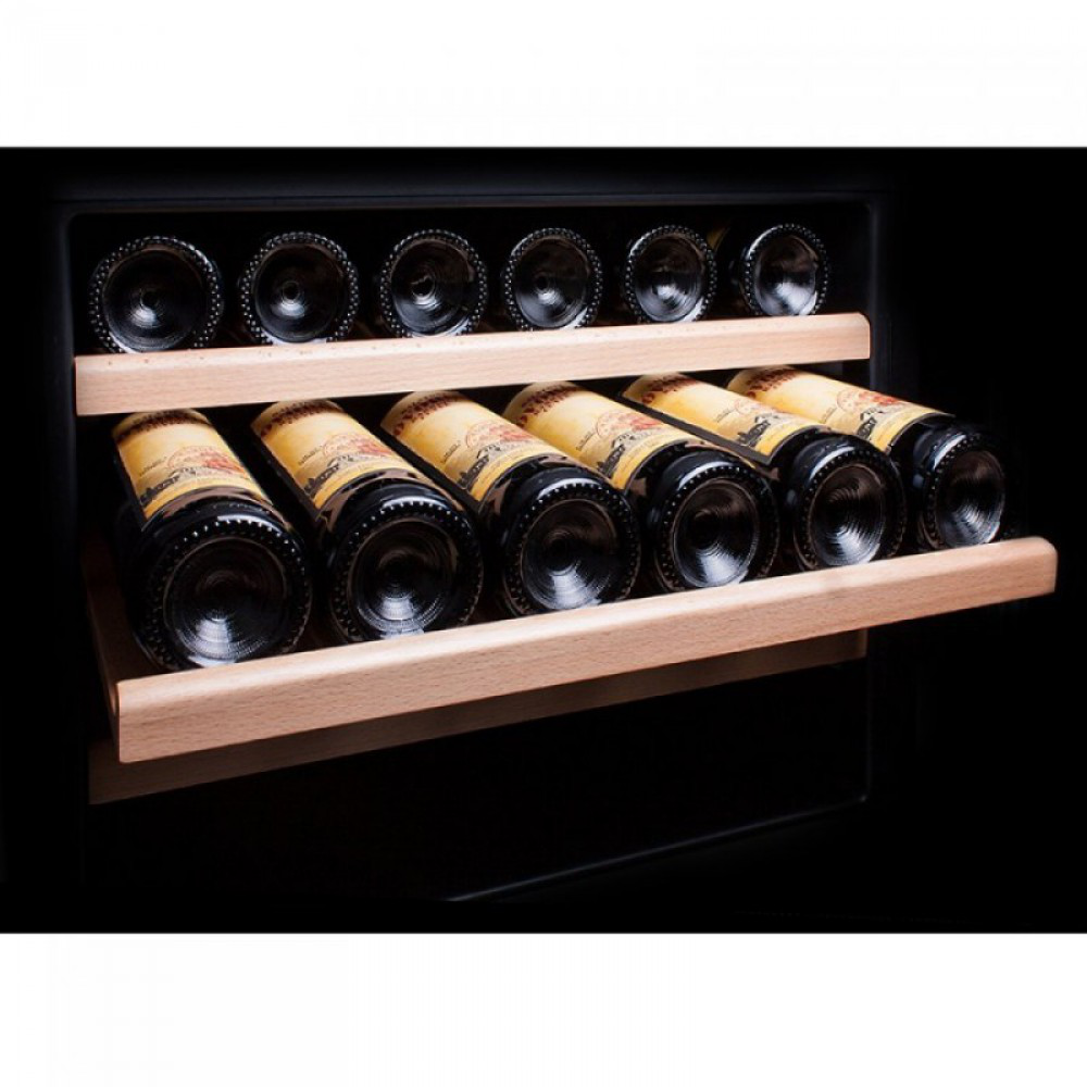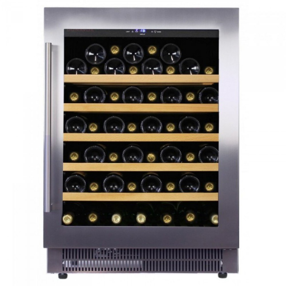 Шкаф для вина Dunavox DAU-52.146SS с минимальным энергопотреблениемВинный холодильник Dunavox DAU-52.146SS с вместительной холодильной камерой будет отличным выбором для кухни или небольшого ресторана.Однозонная модель DAU-52.146SS оснащена внутренним вентилятором для равномерного доступа холодного воздуха ко всем полкам шкафа, угольным фильтром и нагревательным элементом. Комплектуется холодильник DAU-52.146SS шестью деревянными полками. В нем предусмотрена возможность перевешивания двери на другую сторону, что дает дополнительное удобство при установке холодильника в подходящее по габаритам место.Шкаф оснащен электронной панелью управления, с помощью которой пользователь выбирает необходимый температурный режим работы аппарата. В модель DAU-52.146SS встроены такие функции как: функция звукового оповещения об открытой двери, энергосберегающая функция "Отдых", позволяющая при работающем холодильнике (работающем охлаждении вина) на время отключить дисплей, подсветку и звуковые оповещения и функция увеличения влажности воздуха для создания оптимальных условий для хранения и дозревания вина.Элегантный внешний вид винного холодильника DAU-52.146SS подойдет как к интерьеру современной кухни, так и обстановке небольшого ресторана. Корпус из металла с покрытием черного цвета, дверца выполнена из тонированного стекла в бесшовной стальной раме. Ручка шкафа удобная, накладная, выполнена из нержавеющей стали. Цифровой индикатор температуры и внутреннее освещение - на светодиодах синего цвета.Винный шкаф Dunavox DAU-52.146SS легко встраивается под столешницу или может устанавливаться отдельно. Охлаждение компрессора происходит через вентиляционные решетки внизу шкафа, что позволяет встраивать винный холодильник без зазоров.Рекомендуется устанавливать винный шкаф Dunavox DAU-52.146SS вдали от прямых солнечных лучей и источников тепла (духовки, нагревателя, батареи и т.д.). Прямой солнечный свет может плохо повлиять на корпус, а источники тепла могут увеличить энергопотребление. Не допускается установка аппарата рядом с плитой или прибором, который может нагревать воздух в пространстве 1-5 см от его корпуса (например, рядом схолодильником, у которого теплообменная стенка граничит с аппаратом). Не рекомендуется устанавливать прибор на полы с подогревом без специальной термоизолирующей подложки.Отличительные особенностиОдна зона охлаждения.Автоматическая система разморозки.Минимальный уровень энергопотребления.Шесть деревянных полок без лакового покрытия.Увеличенная до 3 лет гарантия.Функциональные особенностиДверца шкафа выполнена из тонированного стеклопакета с защитой от УФ лучей в рамке из полированной нержавеющей стали.Регулируемый температурный режим в диапазоне от +5°C до +18°C подходит для хранения большинства сортов вин.Равномерное поддержание температуры в по всему объему шкафа осуществляется внутренним вентилятором.Функция звукового оповещения об открытой двери.Функция "Отдых".Функция увеличения влажности воздуха.Дверь перевешивается.Угольный фильтр служит для улучшения воздухообмена в шкафу, очищения от посторонних запахов и устранения лишней влаги.Удобная панель управления обеспечивает простую и быструю установку необходимой температуры.Светодиодная подсветка. **Предельные значения температуры в помещенииИзделие предназначено для ра