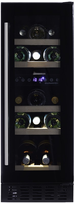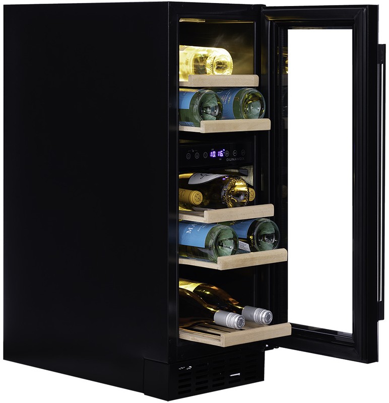 Компрессорный винный шкаф Dunavox DAUF-17.58DB обладает средней вместимостью и способен разместить в себе до 17 бутылок. Располагаются они на выдвижных полках из массива бука.