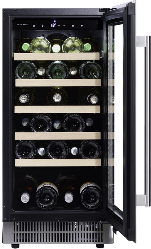 Компрессорный винный шкаф Dunavox DAUF-32.83SS обладает средней вместимостью и способен разместить в себе до 32 бутылок. Располагаются они на выдвижных полках из массива бука.