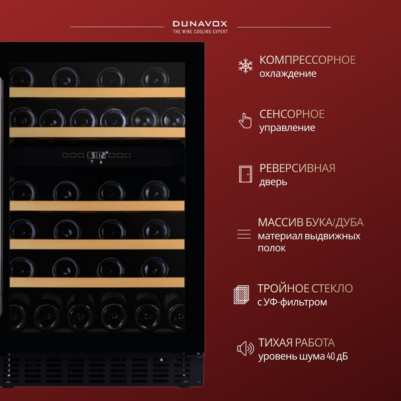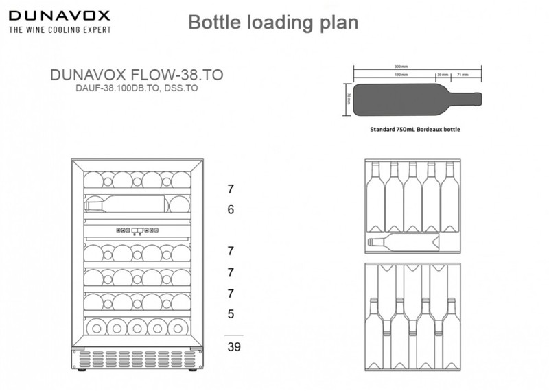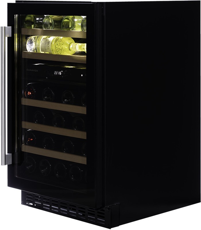 Встроенная система вентиляции создаёт необходимую циркуляцию воздуха для правильной работы винного холодильника. Компрессорный винный шкаф Dunavox DAUF-38.100DB обладает большой вместимостью и способен разместить в себе до 38 бутылок. Располагаются они на выдвижных полках из массива бука.