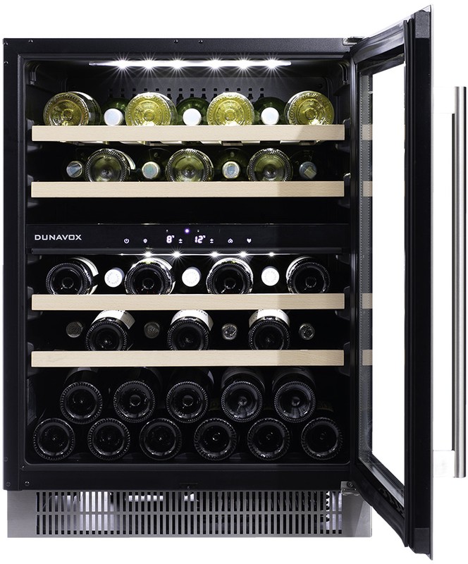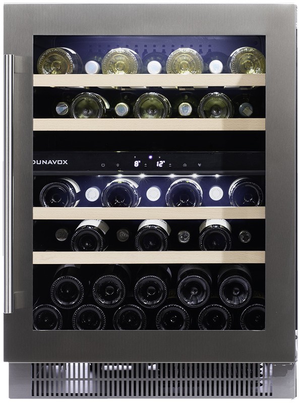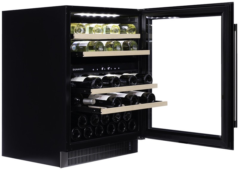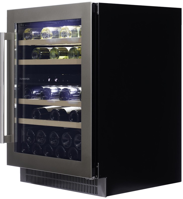Компрессорный винный шкаф Dunavox DAUF-39.121DSS обладает средней вместимостью и способен разместить в себе до 39 бутылок. Располагаются они на выдвижных полках из массива бука.
