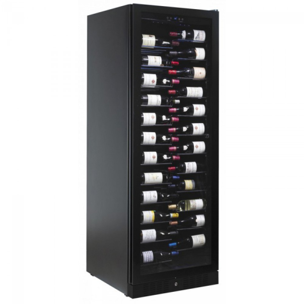 Шкаф вмещает в себя 143 бутылки типа Бордо, имеет одну зону охлаждения и поддерживает температуру от +5°C до +22°C. В верхней части есть сенсорная панель, с помощью которой пользователь выбирает необходимый температурный режим работы в камере. На ней также расположены сенсорные кнопки для регулировки температуры и включения освещения. Данные термостата демонстрирует цифровой экран с приятной светодиодной подсветкой синего цвета.