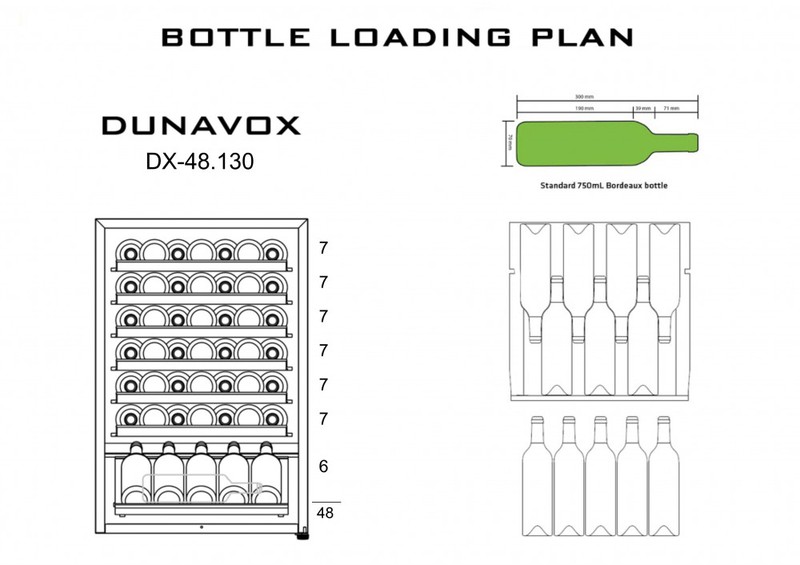 Винный шкаф Duvanox DX-48.130KF может использоваться как отдельностоящий, так и встроенный, с соблюдением необходимых для охлаждения зазоров 2-5 см, т.к. охлаждение винного шкафа осуществляется через нагрев боковых стенок. Также под винным шкафом желательно сделать воздухозаборную решетку с выводом воздуха за винный шкаф, для лучшего охлаждения компрессора.
