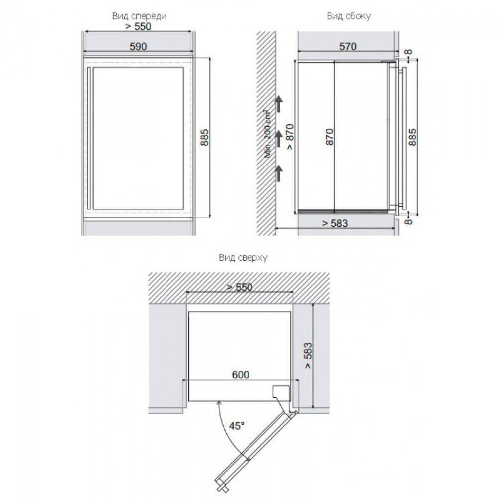Винный шкаф Dunavox DX-57.146DSK предназначен для встраивания в нишу. Для обеспечения охлаждения компрессора и отвода горячего воздуха необходимо предусмотреть сквозную вентиляционную нишу площадью не менее 200 см² от цоколя до верхней части мебельного модуля (см. рисунок).