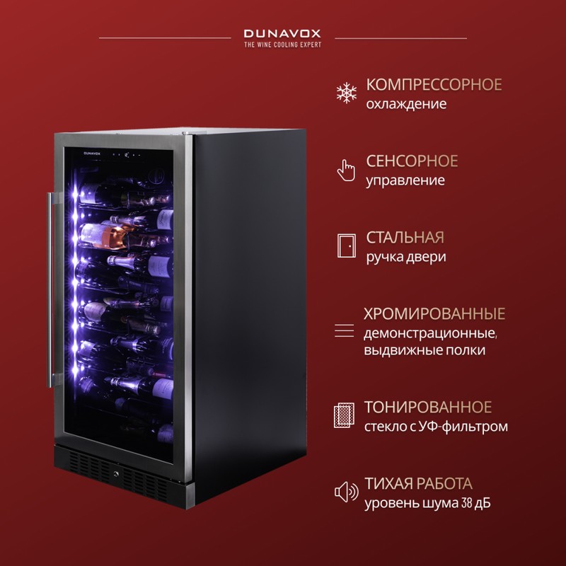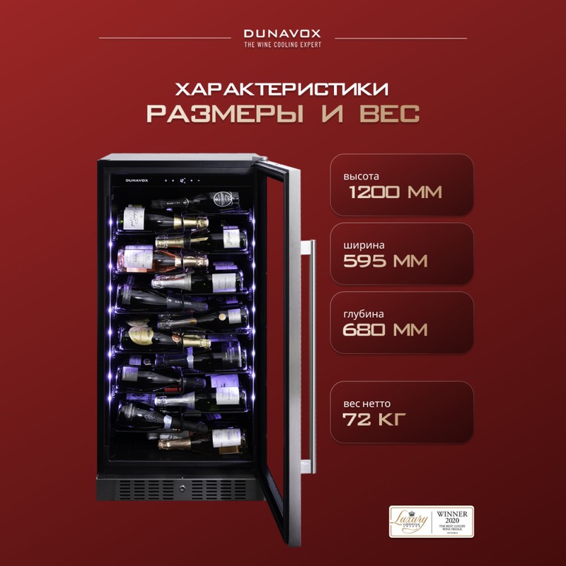 Установить его можно в нишу или колонну Вашего мебельного гарнитура. В качестве дополнительной функции, производители Dunavox разработали реверсивную дверь. Это поможет разместить шкаф в удобном для Вас месте или расположить две модели рядом, создав технологию открытия side-by-side.