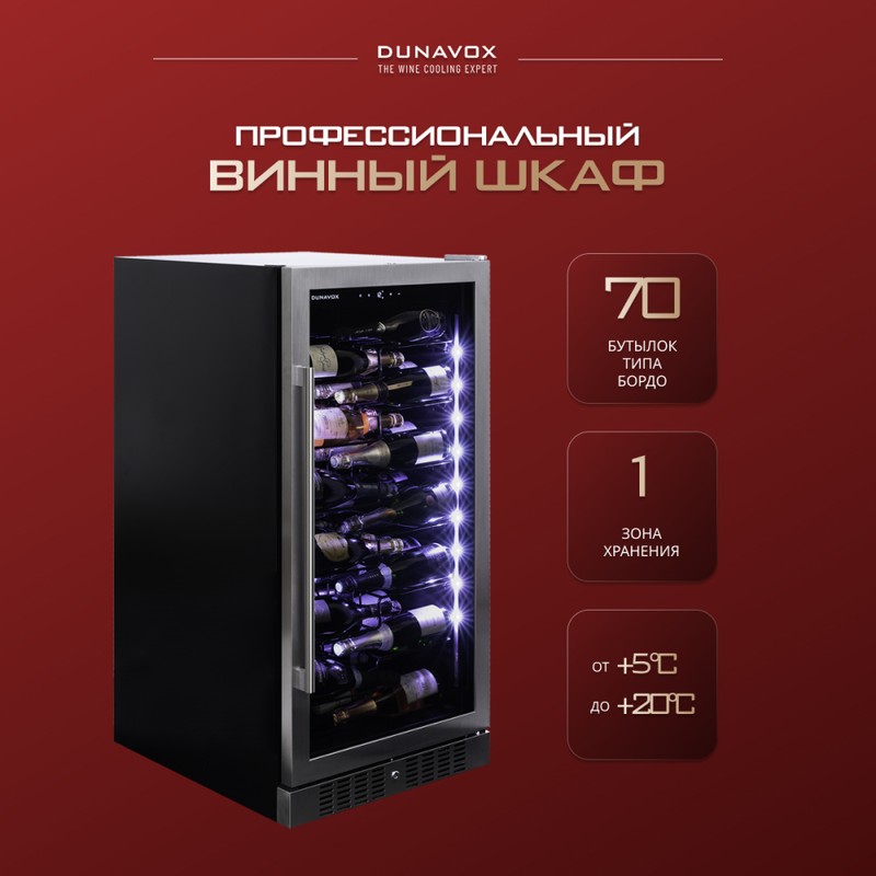 Компрессорный винный шкаф Dunavox DX-70.258SS обладает большой вместимостью и способен разместить в себе до 70 бутылок. Располагаются они на выдвижных демонстрационных полках. Внутреннее пространство шкафа имеет 1 температурную зону с возможностью настраивать внутри от +5 °C до +20 °C. Электронный термостат помогает стабильно поддерживать заданную Вами температуру.