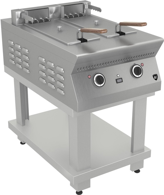900х550х950мм,14 кВт, 400В, ТЭН-4шт., переключатели -2шт. , ток - трехфазный с нейтралью, переменный, 50Гц, 2шт. фритюрных корзины по 400*150*130мм . Макс. загрузка 2*1,0=2,0кг. Объем масла, заливаемого в ванну 2*16,3=32,6л, диапазон регулирования рабочей температуры масла в ванне 20-190С, время разогрева до рабочей температуры 20мин ,