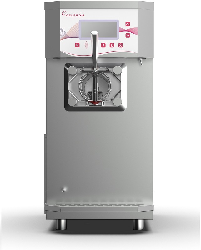 398х750х850 мм, 1,9 кВт, 220 В, 120 кг. Настольный фризер на 1 вкус для мягкого мороженого, замороженного йогурта, молочного коктейля. Производительность 63 л/час (42 кг/час). Цилиндр 3 л, бункер 8 л. Панель управления электронная, регулировка консистенции, шестеренчатая помпа подачи смеси, охлаждаемый бункер с датчиком уровня и системой перемешивания, ночное хранение, пастеризация, насос подачи воздуха в цилиндр, система оттайки цилиндра, счетчик порций, самовозврат ручки блока раздачи. Хладагент R404a. Воздушное охлаждение. Корпус из нержавеющей стали.