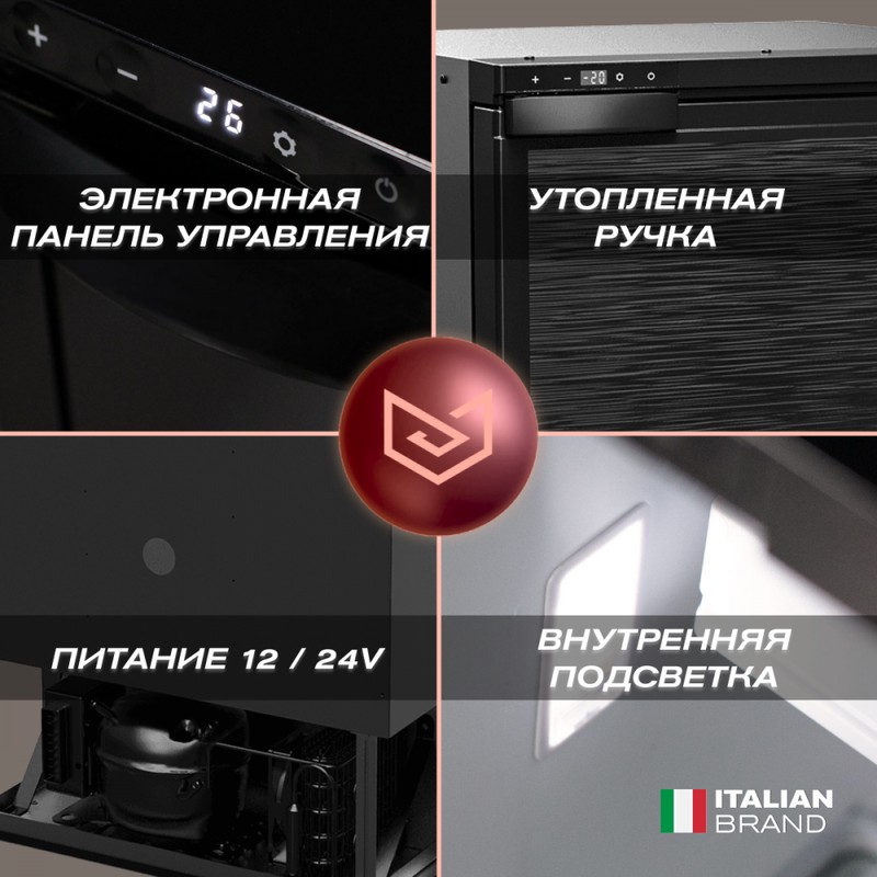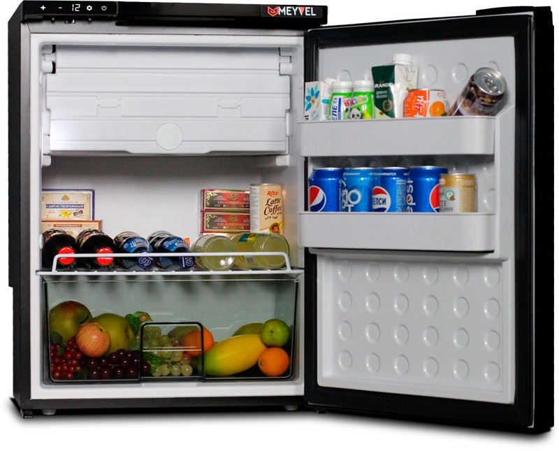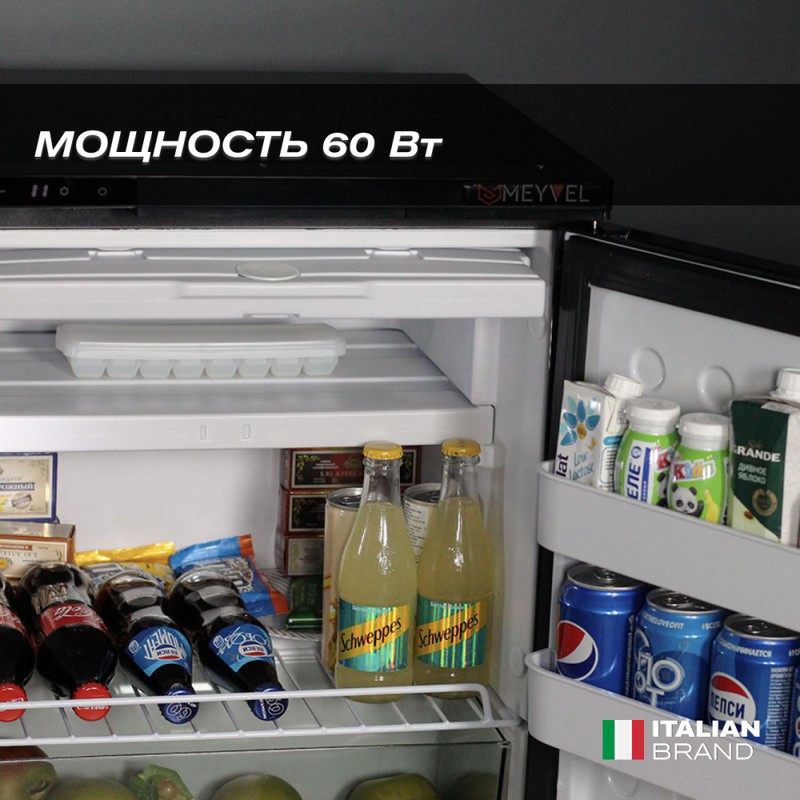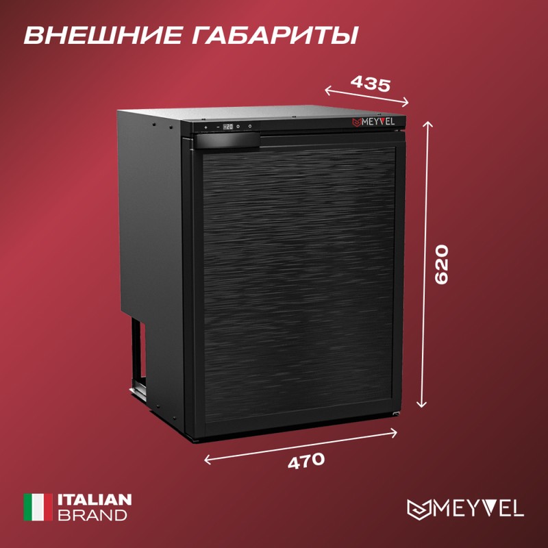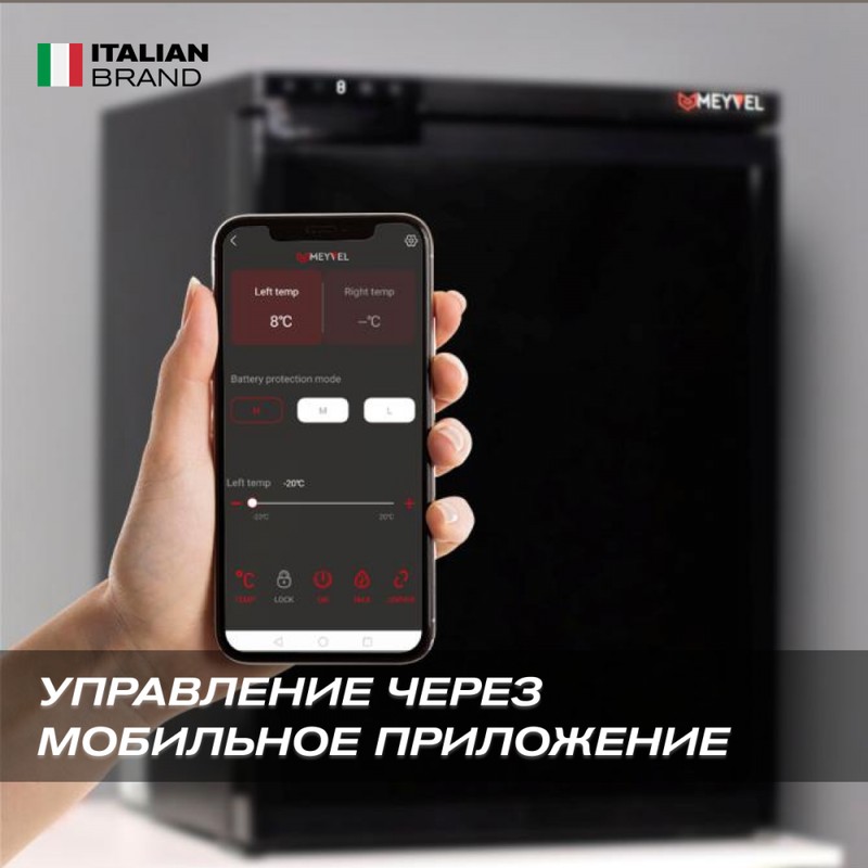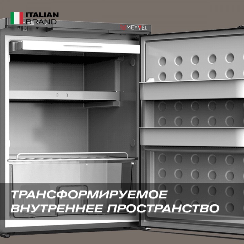 Встраиваемый автохолодильник Meyvel AF-DB65 Итальянская компания MEYVEL была основана в Сицилии. Мы представляем инновационную продукцию, которая отлично подойдет для транспортировки и хранения любимых продуктов и напитков. Так же, благодаря использованию качественных комплектующих и высокотехнологичного производства, наши товары отличаются высокой конкурентоспособностью и отличным качеством. Автохолодильник AF-DB65 это одна из самых востребованных встраиваемых моделей. Он предназначен для установки в микроавтобусах, грузовиках, на яхтах, катерах и конечно же в автодомах и кемперах. Имеет большой объём на 65 литров и возможность питания от сети 12/24 В. Холодильник разделён на две камеры: для охлаждения и для обычной или глубокой заморозки (до -20°C). Ключевая особенность данной модели заключается в том, что внутреннее пространство может изменяться под ваши потребности. Вы можете использовать AF-DB65 и как холодильник, и как морозильник (объём морозильной камеры приблизительно 12л). Так же, благодаря тихому современному компрессору с системой защиты от разгерметизации и с регулируемой скоростью вращения, Вы можете эффективно поддерживать нужную температуру продуктов и напитков в дороге. *Если Вам необходимо только охлаждение или заморозка - в этом случае перегородки морозильной камеры можно легко снять и использовать весь объём как камеру охлаждения, либо как морозильную камеру. *В случае использования всего объёма в качестве морозильника, минимальная температура будет около минус 12°C. Ключевыми техническими особенностями являются: Быстрый монтаж. Вам не потребуется никакого установочного комплекта. Холодильник крепится в нише с помощью саморезов, через четыре специальные отверстия, которые потом закрываются заглушками; Направление открывания двери может изменяться с правого (стандартное исполнение) на левое; Сменная декоративная панель двери позволит Вам максимально адаптировать холодильник к интерьеру автомобиля; Память настроек - при пропадании питания или при недостаточном уровне напряжения - холодильник возобновит работу после появления напряжения по ранее заданным параметрам; Надёжная фиксация двери с помощью магнитного уплотнителя и защёлки, что исключает самопроизвольное открывание двери при движении. Так же эта модель оснащена: Экономичным светодиодным освещением; Съёмными дверными лотками; Выдвижным лотком для овощей и фруктов; Трехуровневой системой защиты от разряда аккумулятора автомобиля; Защитой компрессора от перегрева; Точным электронным термостатом с возможностью корректировки и настройки; Дисплеем повышенной яркости и высоким разрешением; Индикация ошибок на дисплее; Угол наклона компрессора при работе может составлять до 40 градусов. Экологически чистый хладагент, защищённый испаритель и эффективная изоляция обеспечат безопасную, долгую и надёжную работу автомобильного холодильника. Благодаря использованию качественных комплектующих и высокотехнологичному производству, все холодильники Meyvel обладают высокой эффективностью и надежностью. Технологическая линия и процесс производства сертифицированы согласно международным стандартам. Дизайнеры и инженеры Meyvel позаботились о Вашем комфорте и разработали полностью русифицированное мобильное приложение MEYVEL CAR FRIDGE. Скачайте его бесплатн