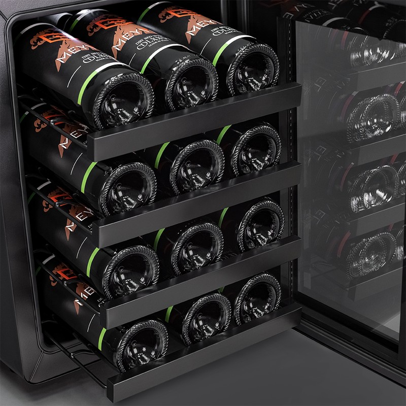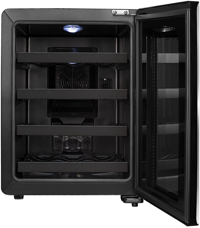 Двойное стекло с защитой от прямых УФ-лучей поддерживает качественные условия хранения вина. Для размещения винных бутылок, шкаф оснащен 4 полками из хромированного металла.