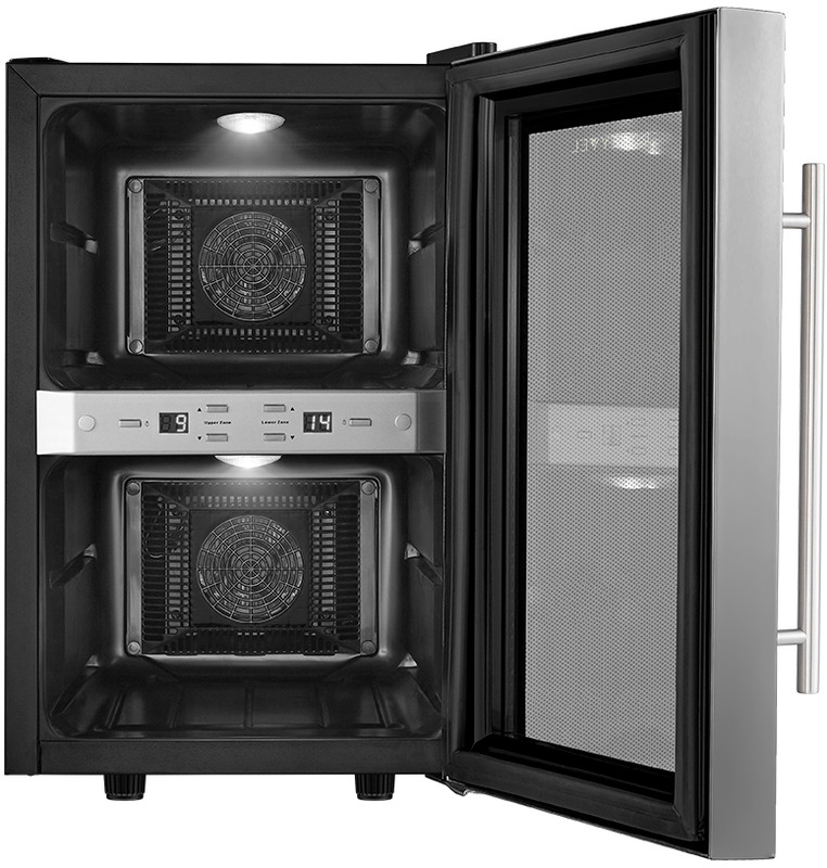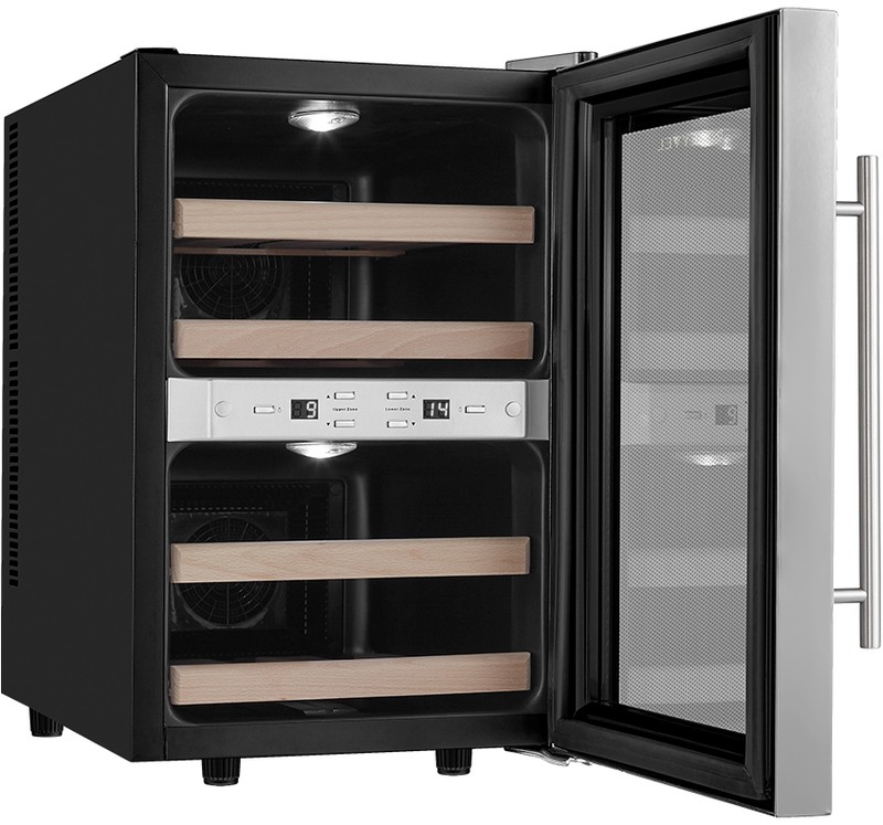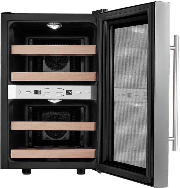 корпус MV12-SF2 (easy) выполнен из стали окрашенной в чёрный цвет, особый стиль шкафу придаёт прочная стальная рама по периметру стеклянной дверцы. Современная технология освещения каждой зоны позволит Вам в любое время эффектно продемонстрировать Вашу винную коллекцию гостям. Вы