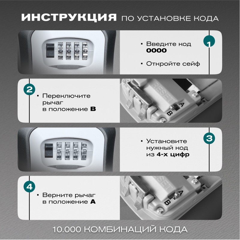 За безопасность содержимого отвечает механический замок с четырехзначным кодом, который предоставляет более 10 000 возможных комбинаций, поэтому вскрытие подбором практически невозможно. В отличие от электронных замков, механический не зависит от батареек и всегда готов к использованию.