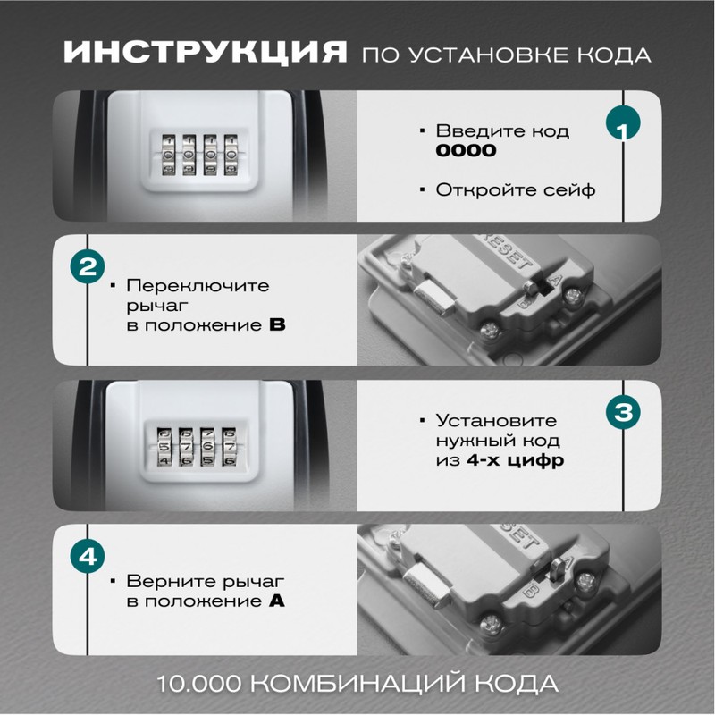 За безопасность содержимого отвечает механический замок с четырехзначным кодом, который предоставляет более 10 000 возможных комбинаций, поэтому вскрытие подбором практически невозможно. В отличие от электронных замков, механический не зависит от батареек и всегда готов к использованию.