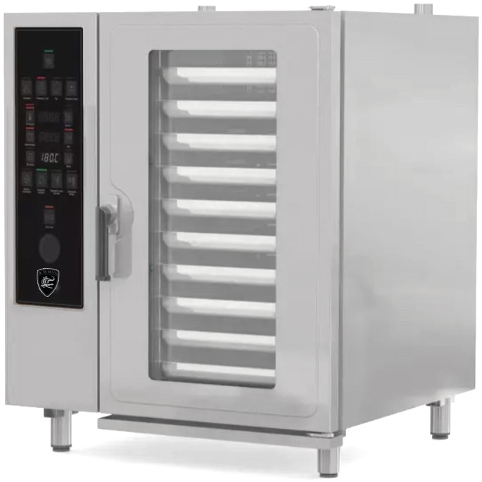 840х800х1055мм, 12,5кВт, 400В, электронная панель управления инжектор, 10хGN-1/1, 300 готовых программ + 200 программ с возможностью записи (9 этапов), вся нерж, безг/емкостей, 3х-канальный щуп, регулировка влажности, вентилятор: реверс + 5 скоростей, автоматическая мойка, 7 режимов мойки. Температурный режим +30…+270С, диапазон установки таймера от 1мин до 10ч. Подключение к водопроводу и канализации, дверь из тройного закаленного стекла, 6 режимов работы, душирующее устройство.