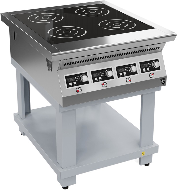 747х850х860/940мм, 4 конфорки, цельная стеклокерамическая поверхность 640х640х6 мм, 4 независимых иидуктора мощностью 3,5 кВт ,9 ур. мощности ,+60..+240? С , 14кВт , 400В , 900 серии, без воздуховода, на крашеной подставке;