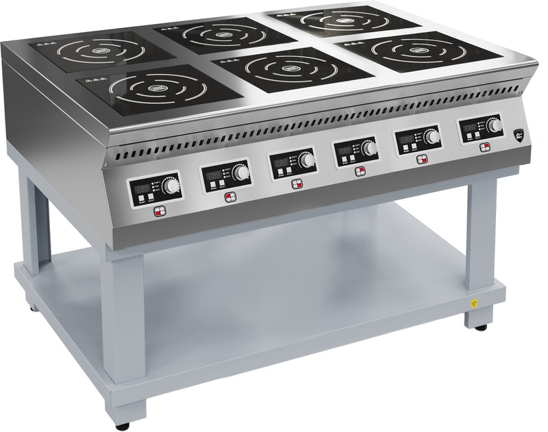 1220х850х860мм, стеклокерамика 6 мм, 6 независимых индукторов мощностью 5кВт, 9 ур. мощности, +60…+240 С, 30 кВт, 400 В, 900 серии, без воздуховода, на крашеной подставке;