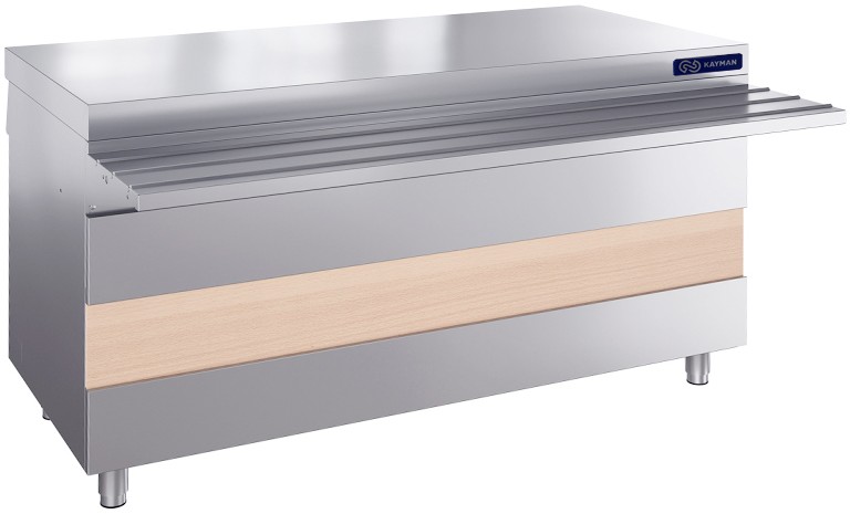 1500х1015х880 20мм. 2 розетки. Предназначен для размещения и подключения электрокипятильника.Возможна модернизация в передвижной модуль при помощи комплекта колес. Конструкция сборная, бескаркасная. Столешница выполнена из нержавеющей стали AISI430 и усилена листом ЛДСП 16 мм. Ножки модуля регулируют высоту модуля в пределах 20 мм. В комплект модуля входит направляющая для подносов (1500х315 мм) выполненная из нержавеющей стали. Вдоль всей фасадной части расположена сменная декоративная панель 1500х190 мм. В нижней части модуля со стороны обслуживающего персонала расположен отсек для хранения посуды и инвентаря. Отсек оснащен одной полкой и двумя дверями-купе. Модуль может дополнительно оснащаться светильником под направляющей.