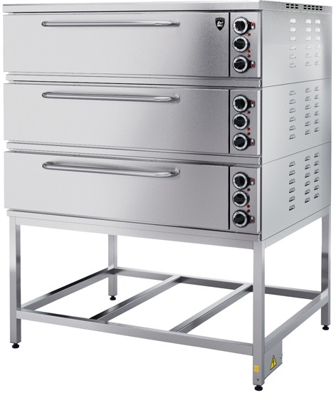 1300х1080х1660мм, 15,6кВт, 400/230В, лицевая часть нерж. сталь, модульная конструкция, три пекарные камеры, внутренний размер камеры 1000*800*180мм, нерж ТЭН-ы, раздельная регулировка верхних и нижних ТЭН-ов (+20…+270 С), под - углеродистая сталь, подставка крашенная, сварная конструкция. Секция и подставка поставляются в отдельных упаковках. Дополнительные опции: противни 470х530х30, нерж.; комплект подового камня, фельзит, 380х495х20мм - 4шт. Упаковка: деревянная обрешетка, поддон.