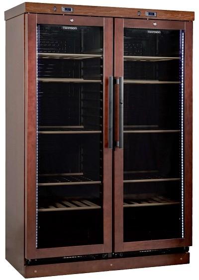1275x620x1837мм, 0,13кВт, 220B, +3/+16, 690л, 185кг, 10 деревянных полок для вертикальной установки бутылок, 216 бутылок диам.75, с встр.агр. R600A, стекл. двери, темный орех
