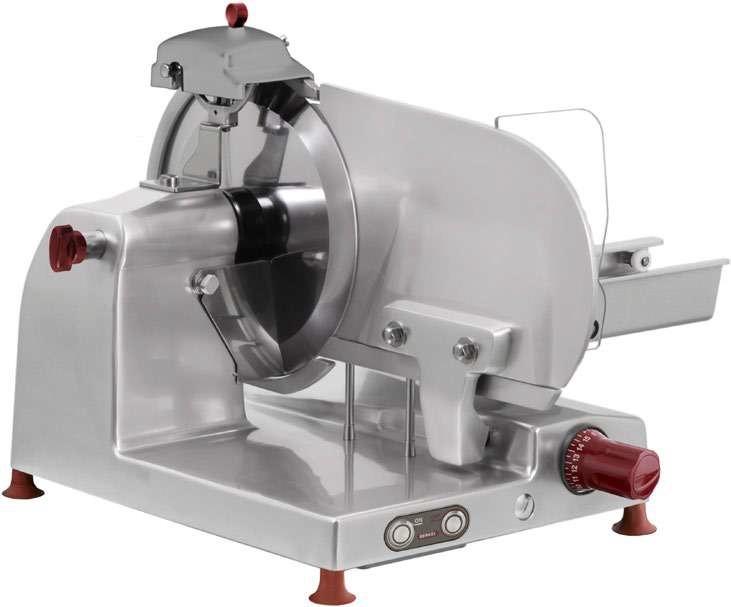 Диаметр ножа 370 мм, Передача редукторная, ручной вертикальный слайсер для нарезки мяса. Толщина нарезки 0-25 мм. Слайсер для профессионального использования на закрытых кухнях ресторанов. Детали из алюминия и нержавеющей стали, корпус из анодированного алюминия с пластиковыми деталями. Встроенное заточное устройство. Специальная конструкция для легкости очистки и точной нарезки.