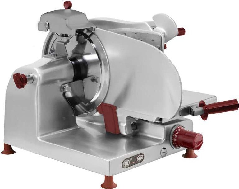 Диаметр ножа 300 мм, Передача редукторная, ручной вертикальный слайсер для нарезки колбас. Толщина нарезки 0-14 мм. Слайсер для профессионального использования на закрытых кухнях ресторанов. Детали из алюминия и нержавеющей стали, корпус из анодированного алюминия с пластиковыми деталями. Встроенное заточное устройство. Специальная конструкция для легкости очистки и точной нарезки.