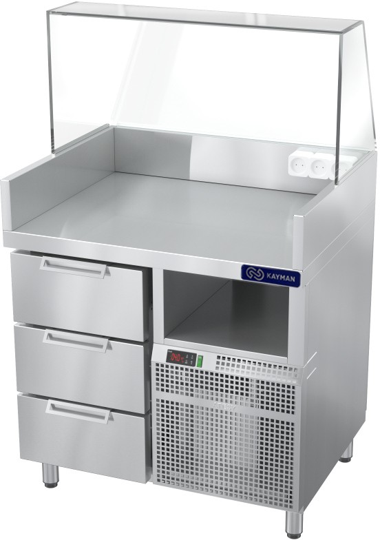 Заказ от 5шт.900х750х1425мм, 4кВт, 220В, мощность холодильного агрегата 0,4кВт, температура охл. объема +2...+6 C.Станция представляет собой закрытый модуль в виде стола с охлаждаемой камерой (рабочего объема) с гастронормированными ящиками (GN1/1х150мм-2шт, GN1/2 х150мм-1шт) и нейтральной нишей для хранения инвентаря: щипцов, салфеток, одноразовой посуды и т.д. Рабочее пространство столешницы предусматривает установку КОМБИ ГРИЛЬ ЭЛЕКТРИЧЕСКИЙ KAYMAN серий КГЭ-6-Н/ КГЭ-7-Н/ КГЭ-7-УС, ГРИЛЬ КОНТАКТНЫЙ ЭЛЕКТРИЧЕСКИЙ KAYMAN серий ГКЭ-1-Р-Ч А/ ГКЭ-1-Р А/ ГКЭ-1-Г А/ ГКЭ-1-2Г А (поставляются отдельно).