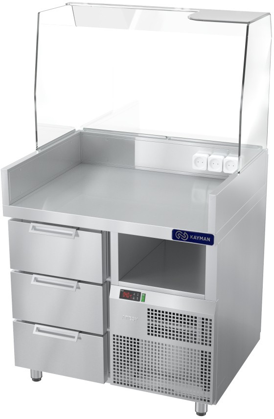 (* - высота по столешнице). Габариты лайт-бокса 895х840мм, габариты постера для лайт-бокса 855х800мм, габариты видимой части постера 835х780мм. Гастронормированные ящики (GN1/1х150мм-2шт, GN1/2 х150мм-1шт) и нейтральная ниша для хранения инвентаря. Рабочее пространство столешницы предусматривает установку: "КОМБИ ГРИЛЬ ЭЛЕКТРИЧЕСКИЙ KAYMAN" серий КГЭ-6-Н/ КГЭ-7-Н/ КГЭ-7-УС, "ГРИЛЬ КОНТАКТНЫЙ ЭЛЕКТРИЧЕСКИЙ KAYMAN" серий ГКЭ-1-Р-Ч А/ ГКЭ-1-Р А/ ГКЭ-1-Г А/ ГКЭ-1-2Г А, а также "ГРИЛЬ РОЛИКОВЫЙ KAYMAN" ГР-1-5 А и подставки ПОДСТАВКА ДЛЯ ГРИЛЬ РОЛИКОВЫЙ KAYMAN ПГР-1-5 А (поставляются отдельно).