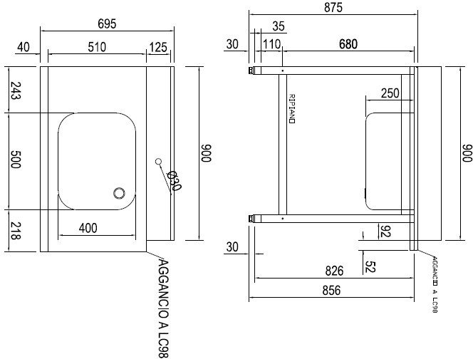 900х695х860мм., ванна 500х400х250мм., бортик, полка; левосторонний (SX/LEFT). спец. версия, рассчитанная на соединение с угловым модулем LC98
