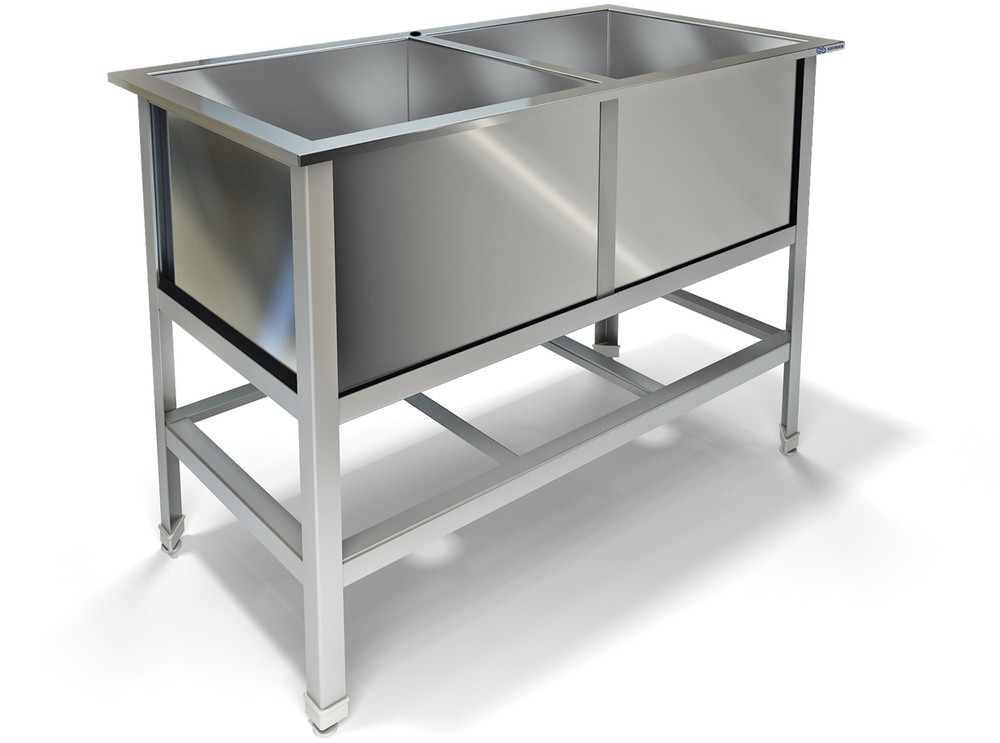 800х430х850, ванна сварная из стали AISI 304 (2 емк.)330х330х300, каркас разборный, уголок из оцинкованного металла, толщиной 1,5 мм, рабочая поверхность из стали AISI 304 , толщиной 0,8 мм