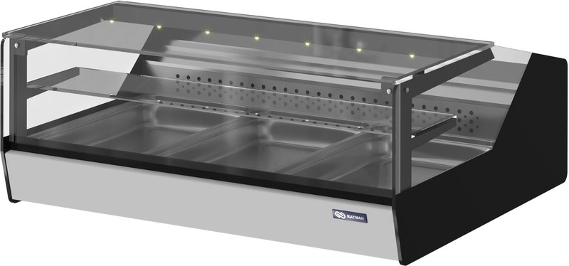 1000Х870Х410мм, t C до +60, корпус из стали, термоизоляция корпуса – пенополиуретан, экспозиционная поверхность из нержавеющей стали. LED подсветка, неохлаждаемая полка, прямое переднее стекло, ночные створки, гастроемкость 1/1х65-3 шт. Витрины предназначены для эксплуатации в закрытом помещении с естественной вентиляцией при температуре окружающей среды от +12 до +25 и относительной влажности не более 60%. Экс. пл-дь 0,5м2. Вес 50кг.